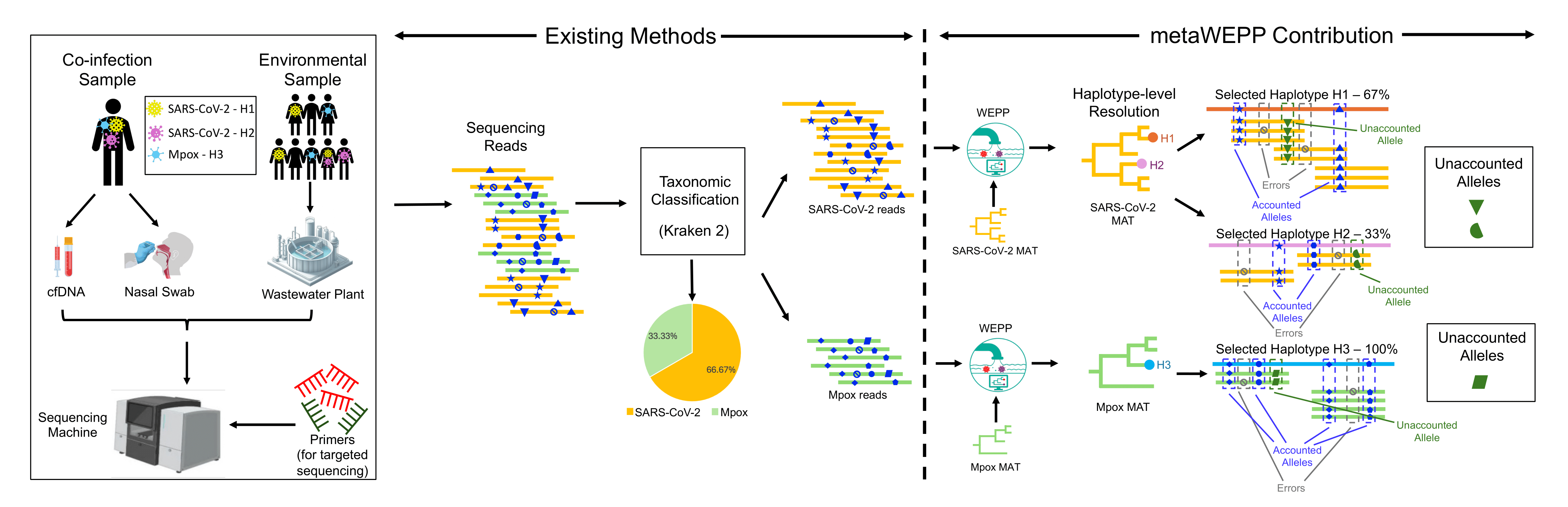 metaWEPP efficiently untangles this complexity by first identifying which organism each genetic fragment belongs to, and then applying WEPP to identify the specific genome variants for each organism. This enables a detailed view of the microbial composition of a sample, supporting applications ranging from clinical diagnostics to environmental and ecological monitoring.